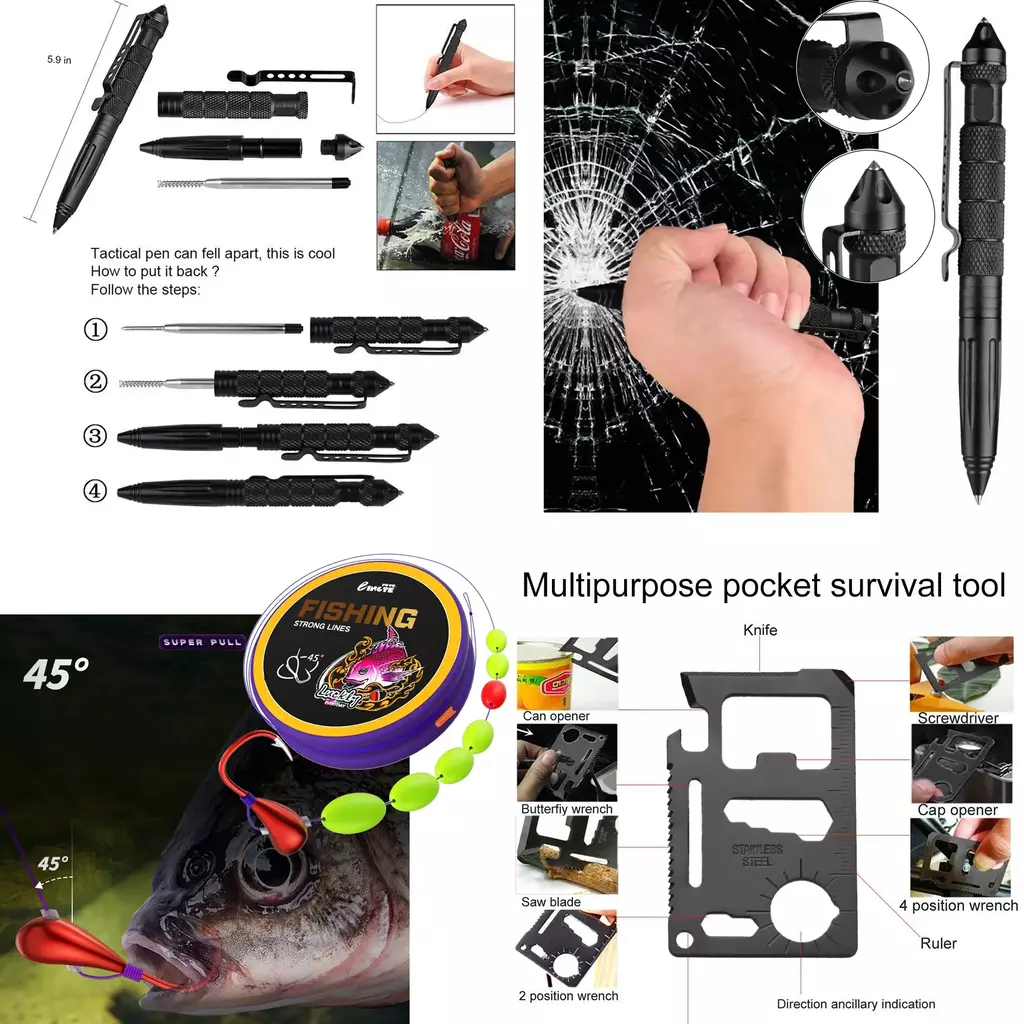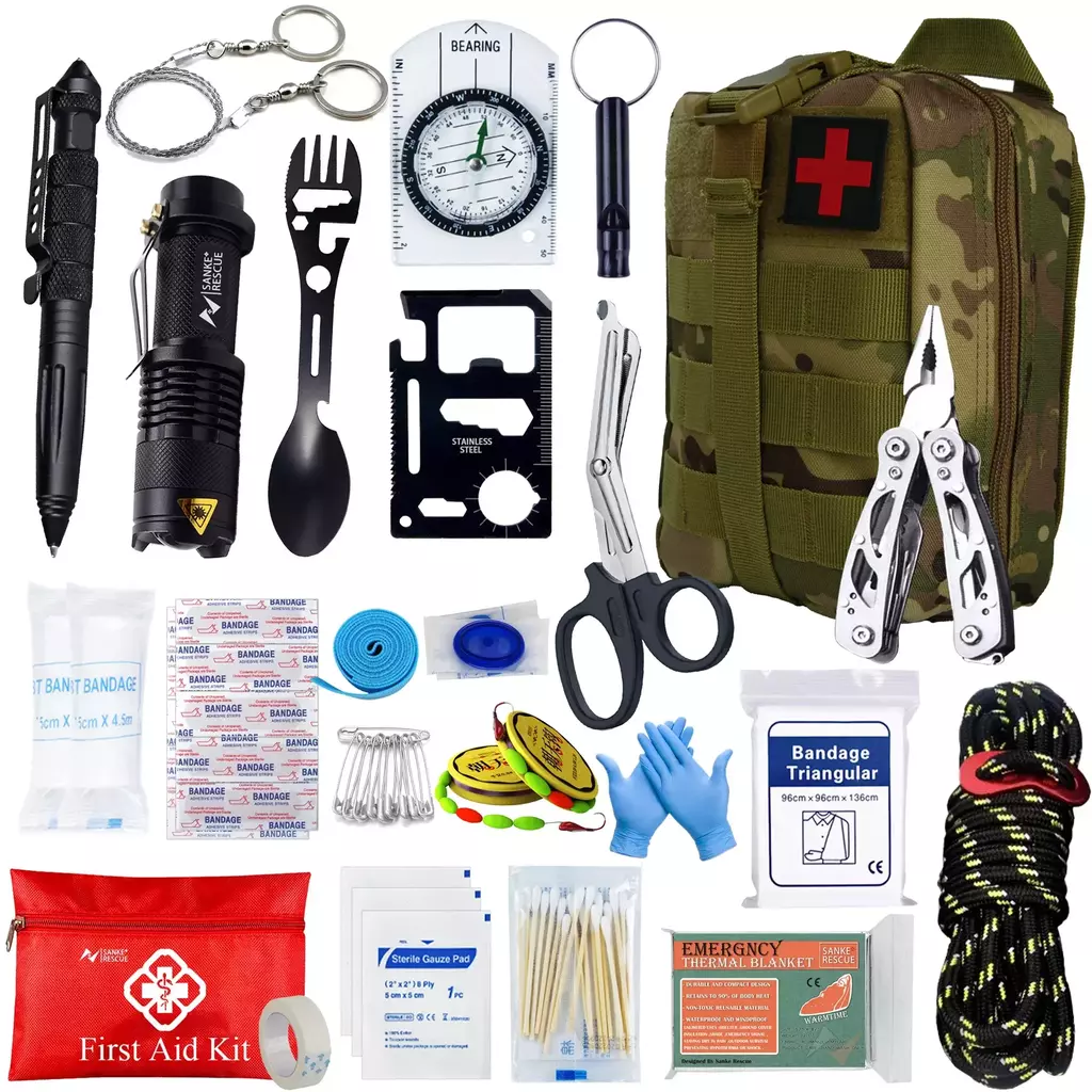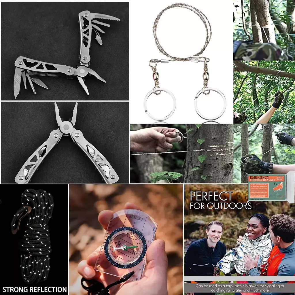 [24 tipos 1 Kit de Sobrevivência]:Ter um kit de emergência é um passo importante para preparar e proteger sua casa para alguns eventos imprevistos.Este kit de sobrevivência de emergência foi projetado e selecionado especificamente por 3 especialistas em sobrevivência, inclui um total de 24 tipos de ferramentas de sobrevivência multiuso.Contém os equipamentos e ferramentas de sobrevivência mais populares, também um kit de primeiros socorros suficiente para tratar uma família ou um grupo de amigos em circunstâncias de emergência.