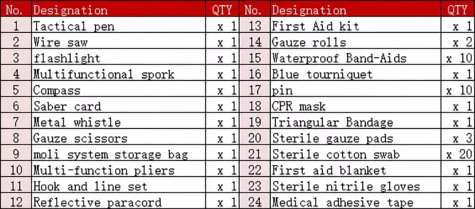 1 | Caneta tática | 1 x | 13 | Kit de primeiros socorros | 1 x |
